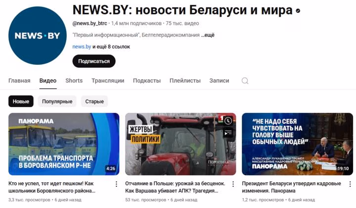 YouTube-канал NEWS.BY публикует сюжеты государственного телеканала «Беларусь 1», в том числе новостные выпуски и пропагандистскую «аналитику». Раньше каждый день на нем появлялось по несколько видео, однако после 13 октября он обновляться перестал. «Зеркало» попыталось узнать причину.